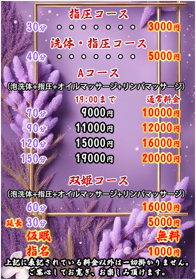 マッサージ技術+おもてなし心+高い美意識を併せ持つ厳選されたセラピストが貴様の体調・お好みに応じて究極の癒しマッサージを提供させていただきます。個室の空間で全てを忘れセラピストのリズムに身を任せ貴様自身を取り戻してください疲れた体を癒しながらストレスの発散をし、健やかな状態を保ちます。